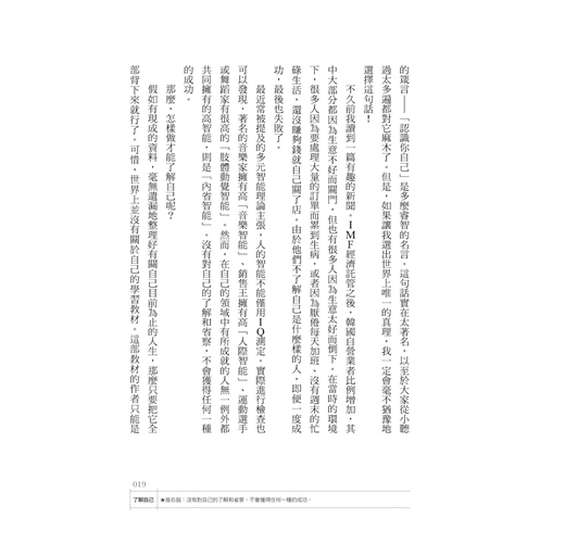 最近常被提及的多元智能理論主張,人的智能不能僅用IQ測定。實際進行檢查也可以發現,著名的音樂家擁有高「音樂智能」、銷售王擁有高「人際智能」、運動選手或舞蹈家有很高的「肢體動覺智能」。然而,在自己的領域中有所成就的人無一例外都共同擁有的高智能,則是「內省智能」。沒有對自己的了解和省察,不會獲得任何一種的成功。