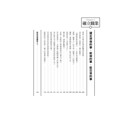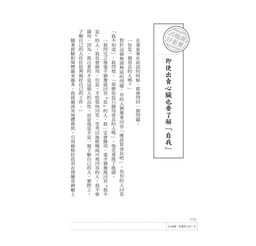 第二,雖然他們都說自己「二十幾歲的時候一事無成」,但實際上正是他們的二十歲造就了現在的他們。儘管當年的他們和普通年輕人一樣遲鈍又愚蠢,但他們比任何人都更早清醒、行動、受挫、領悟。當我決定寫關於男人成功生活的書時,我最先對自己提出的問題是「成功是什麼」。按照通俗的觀念,擁有錢或名譽,或者兩者皆有才算是成功嗎?又或者,達到即使拋棄一切也能享受內心和平的境界,擁有這種心靈的力量,才算是成功?