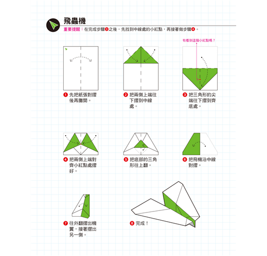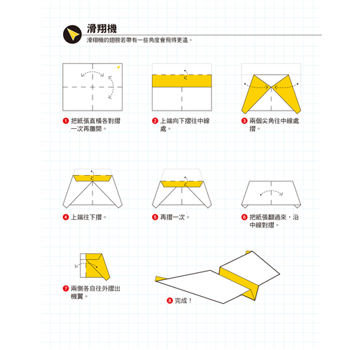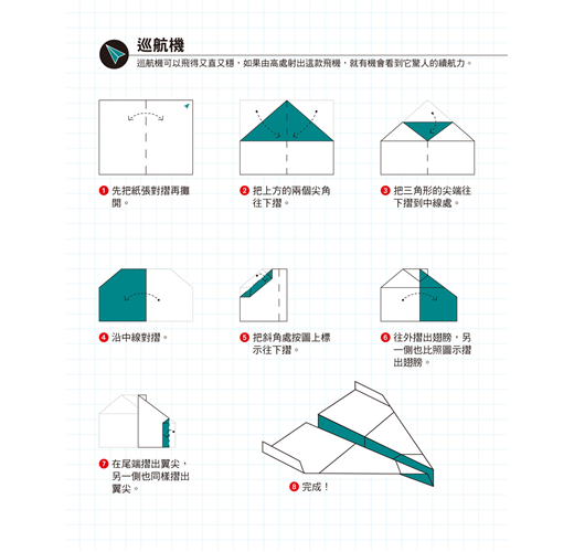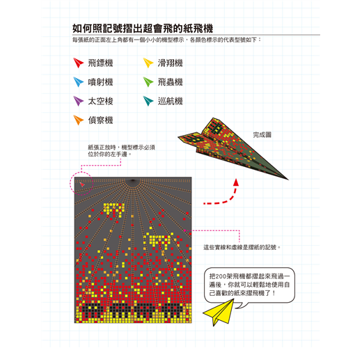 直覺式指線設計,無論是基本款的飛鏢機、太空梭、飛蟲機、噴射機,或是可以高速飛行巡航的偵察機、滑翔機、巡航機,只要照著指線,隨手便可摺成完美紙飛機。
