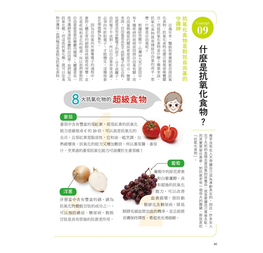 抗氧化(抗老化)、減肥瘦身→花椰菜、葡萄、洋蔥、紅蘿蔔、南瓜……