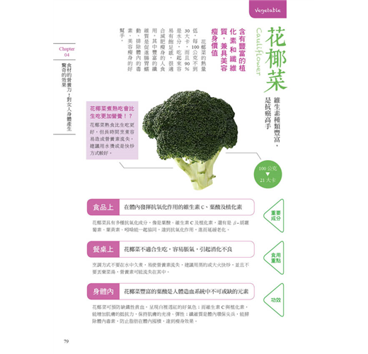 針對女人的各種需求,如豐胸、瘦身、助孕等,特選出60種女人必備超級食物,分別介紹食物的營養重要成分、餐桌上的食用重點、身體內的功效,例如:花椰菜含抗氧化作用的維生素C、葉酸和植化素,但不適宜生吃,因為容易產生脹氣,引起消化不良。