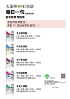 《大家學標準日本語 初‧中‧高》是學日語必備的127個文型文法指南(具體學習目標),而《每日一句 全系列五冊:生活實用篇、商務會話篇、旅行會話篇、談情說愛篇、生氣吐槽篇》則是「將必學的文型文法落實於真實會話的具體教學」。