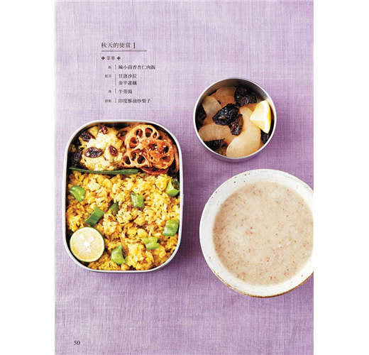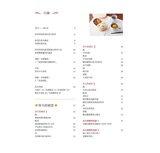 這本書,融入印度流傳下來的阿育吠陀醫學智慧,介紹許多便當的食譜。這些食譜,以對應四季的蔬菜為主,一邊使用香料和油,即使是早上匆忙的時間也能簡單製作,變冷也十分美味的食譜。當然,不只是美味,也能給予身體和心靈營養,幫助成長,強身,能在被稱為Ojas活躍的生命能量裡呼吸而生生不息。