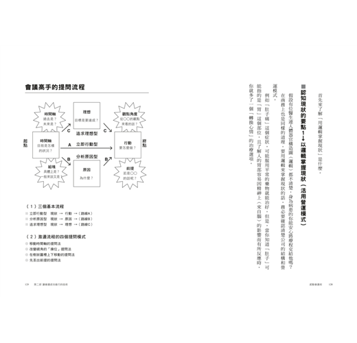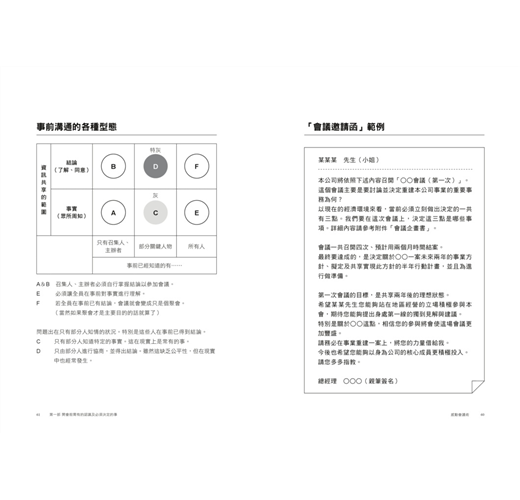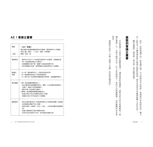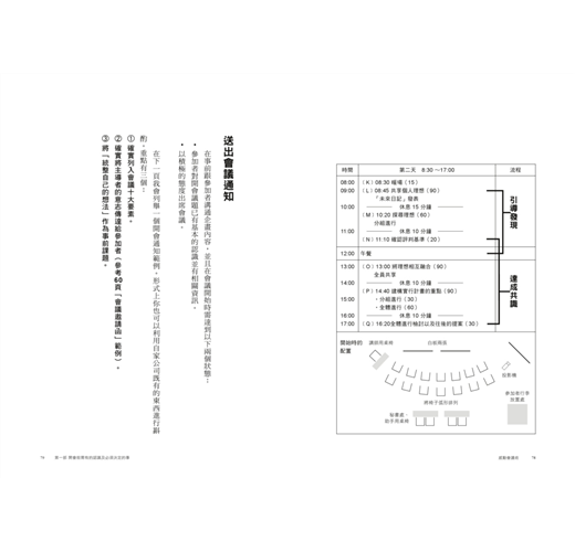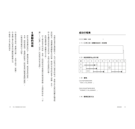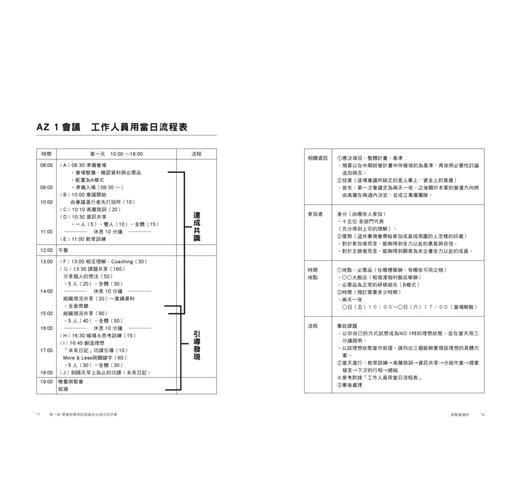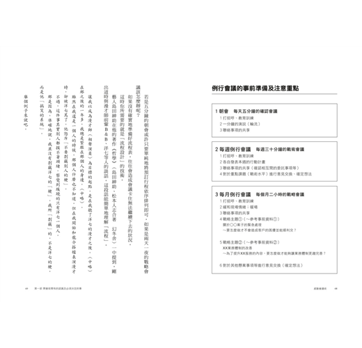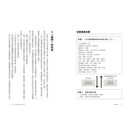本書介紹了許多我從成功企業及開會高手那歸整出的會議知識與技術,並搭配實踐步驟,諸如教練式領導、邏輯性思考、NLP(神經語言學)、專案管理、問題解決法、內心交流、市場行銷、經營品質……等等。