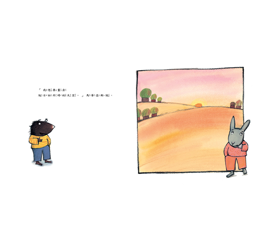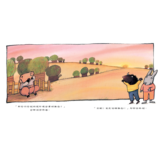 皮娜洛普是個貼心的朋友,她不是直接把自己的答案告訴馬蒂亞斯,而是以實物來提醒馬蒂亞斯生活中的事物和千變萬化的天空相對應的顏色,比如小豬阿璜的皮膚顏色、鸚鵡色彩豐富的羽毛顏色……