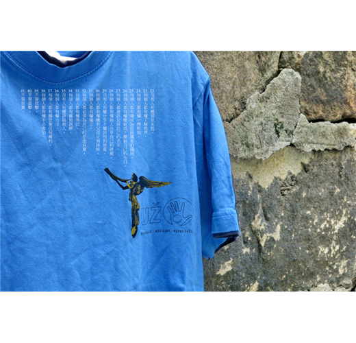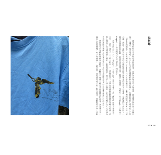 現任總統、也是憲章的起草人之一李雷基斯(RomasLileikis)本身就是個詩人、音樂家、電影導演。二〇一三年的新北市電影節,我特別邀請他攜兩部作品來台放映。他是個大鬍子,十分感性。他特別解釋烏哲邦的圖像:一隻手上有一個圓洞,意思是「什麼也留不住」。真是禪意十足啊!他送我一件T恤,正面是號角天使,背面則印了烏哲邦的憲章。這份憲章裡面不乏互相矛盾的條文,玩笑地表達了居民對自由與人性的坦率追求,除了前三十八條對權利的全新界定,最後三條「不要攻擊。不要還擊。不要放棄。」則強調了他們柔軟卻堅定的態度。憲章以十五種語言的版本展布在一條街上,吸引著各國遊客圍觀、讚嘆、莞爾。可惜中文不在其列,我就擅自翻譯了。既然憲章內有一條是「每個人都有權成為任何國家的國民」,讀完之後,誰不想也成為烏哲邦的公民?或是也想創立一個屬於自己的國家?