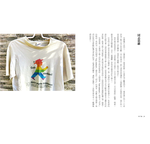 但我是第一次看到小綠人改穿同志的彩虹條紋。上頭寫著「Gehdenken!」是德文「思考」的動詞。然而另一版寫的則是「Gay denken!」顯然在玩「同志」的諧音。我衝上前去想買,他們打開仍在移動的麵包車後門取貨。我邊加快腳步、邊把T恤買下,並經常穿在身上,繼續他們的遊行。