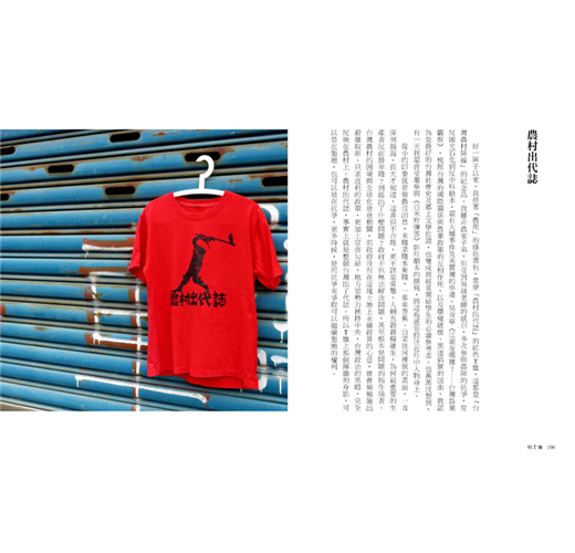 從小的印象就是做農沒出息,米賤菜賤水果賤,一車車香蕉、白菜往河裡倒的畫面,一直深刻腦海。長大才知道,這非但不合理,更不該是常態。人賴五穀雜糧維生,為何最重要的生產者反而最卑賤?到底出了什麼問題?政府不但無法解決問題,甚至根本是問題的始作俑者。台灣農村的困境與全球化息息相關,但政府沒有在這塊土地上永續經營的心意,就會頻頻施出殺雞取卵、只求近利的政策,更加上官商勾結,地方惡勢力挾持中央,台灣政治的黑暗,完全反映在農村上。農村出代誌,事實上就是整個台灣出了代誌。所以T恤上那個揮鋤的身影,可以是在墾地,也可以是在抗爭,更多時候,是用抗爭來爭取可以繼續墾地的權利。