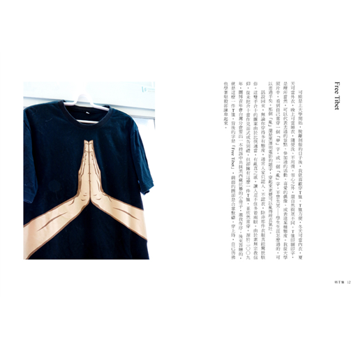 話說回來,無論你穿得多有態度,通常人家只認人、不認衣,除非那件衣服真能驚世駭俗。這雙手合十的圖案由於比例適當,有亂真之感,讓人忍不住多看兩眼。由於素無宗教信仰,從未把合十當作見面式或告別禮,但卻擁有這麼一件T恤,並欣然常穿。源於二〇〇九年,圖博青年會台灣分會要出一本控訴中共抹黑西藏抗暴的小冊子,邀我作序。後來答贈的,就是這麼一件T恤。背後的字是「Free Tibet」,前面的圖卻是合掌默禱。穿上時,自己彷彿也學著堅毅卻謙卑起來。