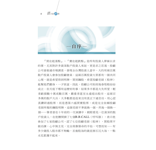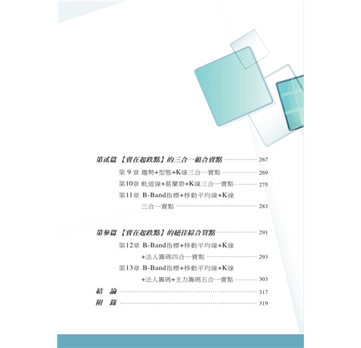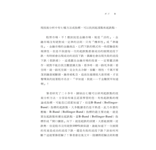 筆者從事投資研究二十多年來,歸納出七種可以研判起跌點的技術分析方法,從K線理論、趨勢理論、型態理論、移動平均線乃至於作者新出版之圖解B-Band指標。從最基礎的理論架構到實例的投資應用,用深入淺出的方式搭配圖示一一說明,並貼心的在每個章末統整出買進訊號的SOP,不論是剛入門或是股場好手,皆可以在融會貫通後運用於賣出技巧,有別於一般技術書籍過於艱深的內容,絕對是投資者必備的書籍。
