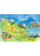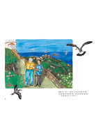 書本的最後一幅,畫的是從海上遠觀東引島和島上的燈塔,好像是讀者參觀過後,搭船返航看到的景象,燈塔因為距離的遙遠,而變得好小好小,但是它在我們心中,映照的卻已經是不易抹去的巨大,如同作者畫在空中的影像,一座和東引別墅家族一起,還要度過好幾個百年,見證更長遠的歷史,照顧更多更多航行船隻的安全。