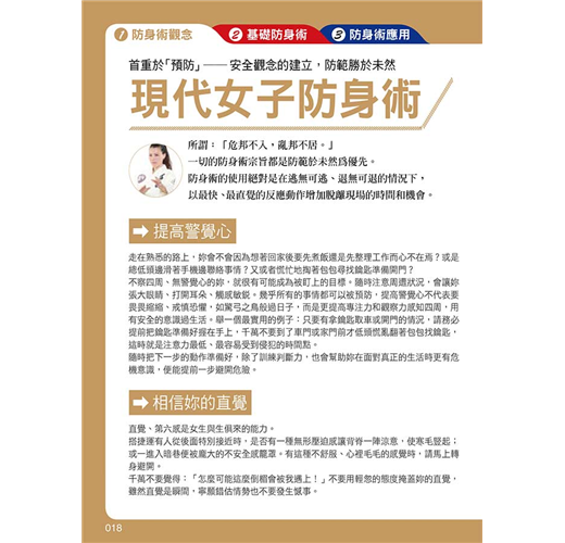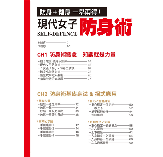 但透過丁郁芬老師實用生動的教學,只要勤練與活用6個基本動作,就能讓妳掌握防身術中的防衛、脫逃、擒拿與鍛鍊身體四個目的,在實際搏鬥中,應用摔、打、拿、點等技巧,必能克敵致勝、發揮防身最大效能。