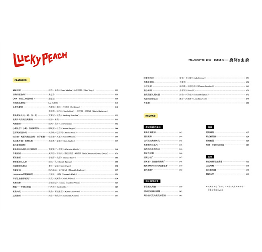 《Lucky Peach》是全新型態飲食生活誌,採季刊形式發行。背後創作者包括紐約知名餐廳Momofuku主廚、《時代》雜誌百大人物和評選食神、James Beard獎得主的大衛張、《Momofuku》美食書的共同作者彼得.米漢,以及製作TLC旅遊生活頻道節目「波登不設限」的艾美獎得主的Zero Point Zero製作公司。
