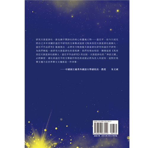 研究天狼星詩社,誰也繞不開詩社的核心和靈魂人物——溫任平,如今川成兄將自己多年來關於溫任平研究的文章集成這部《馬來西亞天狼星詩社創辦人:溫任平作品研究》隆重推出,必將有力地推進天狼星詩社研究和溫任平研究,爲我們樹起一座研究天狼星詩社的里程碑。我們有理由相信,隨著這部《馬來西亞天狼星詩社創辦人:溫任平作品研究》的出版,天狼星詩社的「神話王國」必將解密,總社長溫任平的文學創作特色和成就必將爲世人所認知,這對於馬華文壇乃至世界華文文壇都是一件幸事。