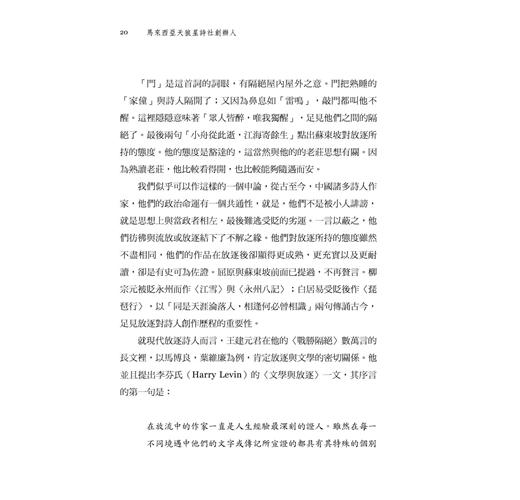 就現代放逐詩人而言,王建元君在他的〈戰勝隔絕〉數萬言的長文裡,以馬博良,葉維廉為例,肯定放逐與文學的密切關係。他並且提出李芬氏(Harry Levin)的〈文學與放逐〉一文,其序言的第一句是: