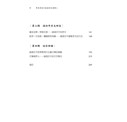大學畢業之後,我繼續撰寫詩論,但是不知為什麼很少再論及溫任平的詩,只在一九八八年寫了〈海的呼吸與歷史的興衰―評溫任平的《聽海》〉2,和一九九六應南洋商報《南洋文藝》「溫任平特輯」之邀寫了短文〈不知是微喜還是悲傷―溫任平近作概覽〉3,之後就沒有再研究他的詩。不僅是詩,連他的散文我也甚少談論。一九八九年天狼星詩社結束所有的活動之後,我的文學創作幾乎熄火停工,只是偶爾寫一兩篇文學評論。一九九七年,馬來西亞留台聯總主辦文學研討會,我也受邀參加,於是就寫了一篇關於溫任平為別人文集所寫的序文的論文,題目是〈優劣並陳,啟發引路―論溫任平的序文〉。溫任平的序文不止這種類型而已,還有好多篇是為詩選、文學選所寫的序文。於是就繼續研究他的的序文,寫成另外一篇論文〈銓序一文為易,彌綸群言為難―論溫任平選集序文的方法〉。