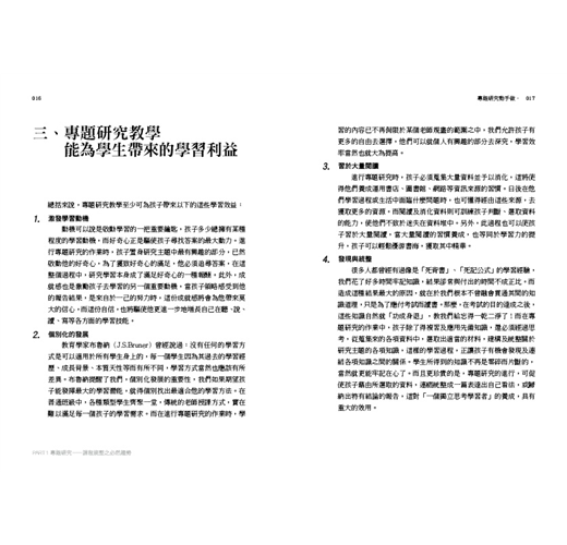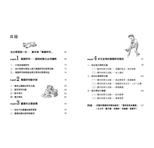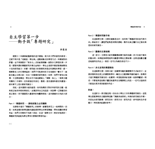 因此,這本書要介紹的就是:如何指導孩子對於所研究的主題,能夠真正地有所吸收與消化,並嘗試用自己的話語,來詮釋一己對題目的真正看法,而不僅僅是大量資料的堆疊與剪貼。這本書總共分為四大部分: