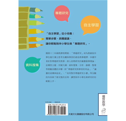 隨著十二年國教課程開展,「專題研究」成為教師陪伴學生進行獨立思考及團隊學習的最佳教學選擇。本書作者針對專題研究教學,納入長期研究的圖書館學理論,從構思主題、初擬大綱、資料蒐集、分析、篩選、整理等微觀具體的步驟,到「專題研究對學習的效益」、「圖書的結構與組成」、「如何製作專題研究小書」等全觀整體的內容做了最完整的呈現,讓想陪伴小學生做研究的你輕鬆上手。