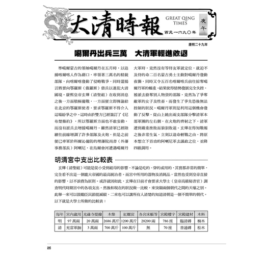 《大清時報》將清朝二百多年的歷史事件,分成「首部曲‧八旗建國」、「二部曲‧開創盛世」、「三部曲‧帝國哀歌」三部分來呈現。