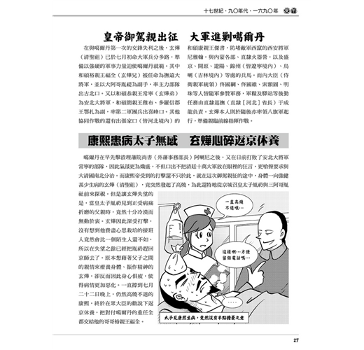 本書是繼《大清時報 首部曲‧八旗建國》之後的二部曲,依照時間的進程,以「康熙勤政 盛世開啟」、「兄弟競儲 雍正稱帝」、「乾隆新政 邁向頂峰」、「十全天子 盛極而衰」四部分,呈現出這段黃金盛世的璀璨。從清廷確定將臺灣納入版圖的一六八四年開始,到乾隆退位前的一七九五年之間,以二十幾萬字的內文、五百多則的新聞事件,以及三百多張我自己親繪的插圖,重現康乾盛世的榮光。我們在此一睹康熙大帝執政的心路歷程,窺探諸位阿哥競儲的明爭暗鬥,見識四爺雍正莫測的政治手腕。在讚嘆乾隆時期霸氣的同時,也垂淚於東方巨龍的閉關沉睡。同時,在相關新聞出現的版面,也收錄了如「皇太子的功課表」、「科舉考試」、「圈禁」、「蘇麻喇姑」、「達賴與班禪」、「雍正繼位之謎」、「軍機處」、「幕府師爺」、「香妃傳奇」……等多篇的專題報導,來增加閱讀的深度。