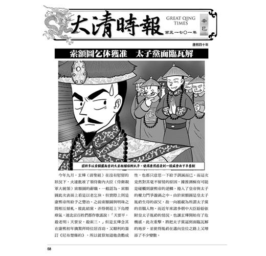 本書是繼《大清時報 首部曲‧八旗建國》之後的二部曲,依照時間的進程,以「康熙勤政 盛世開啟」、「兄弟競儲 雍正稱帝」、「乾隆新政 邁向頂峰」、「十全天子 盛極而衰」四部分,呈現出這段黃金盛世的璀璨。從清廷確定將臺灣納入版圖的一六八四年開始,到乾隆退位前的一七九五年之間,以二十幾萬字的內文、五百多則的新聞事件,以及三百多張作者自己親繪的插圖,重現康乾盛世的榮光。我們在此一睹康熙大帝執政的心路歷程,窺探諸位阿哥競儲的明爭暗鬥,見識四爺雍正莫測的政治手腕。在讚嘆乾隆時期霸氣的同時,也垂淚於東方巨龍的閉關沉睡。同時,在相關新聞出現的版面,也收錄了如「皇太子的功課表」、「科舉考試」、「圈禁」、「蘇麻喇姑」、「達賴與班禪」、「雍正繼位之謎」、「軍機處」、「幕府師爺」、「香妃傳奇」……等多篇的專題報導,來增加閱讀的深度。