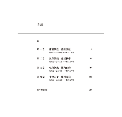在一次閒聊之間,老婆大人突然興奮的說她發現了一件很了不起的事,就是前幾年紅遍兩岸的《後宮甄嬛傳》居然在美國電視上演,還……加上了英語配音。的確,由帥氣的阿哥、俏麗的格格,再加上心機算盡的后妃們所串演的清宮劇,一直是娛樂圈中不敗的體裁。雖然戲劇故事不能當真,電視情節並非史實,但一部接著一部上檔的賣座劇集,卻證明了兩岸三地的朋友,甚至連金髮藍眼的外國人,一旦被這股神秘而華麗的紫禁魅力所纏上,就得每天乖乖的奉獻出二十四分之一的時間,讓自己隨著劇情的發展步步驚心。而由康熙、雍正、乾隆祖孫三代所開創的大清盛世,就是這些令人揪心的愛恨情仇,動人肺腑的闊瀾史詩,所最喜歡取材的時代。
