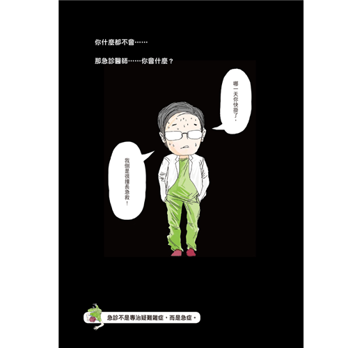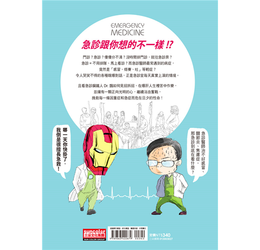 可見,要用三言兩語來介紹急診或急診醫師,談何容易。如今急診界卻出現一位全身上下充滿熱情,又自勉是鋼鐵人的急診醫師,願意貢獻其創意與天分,以極其細膩、詼諧卻又帶著淡淡憂愁的漫畫形式,將急診醫師日常所見所聞的景象描繪出來,藉此與社會大眾一起分享急診的點點滴滴。而這樣的呈現方式,對我這麼一位死守急診已經二十幾年的老戰士而言,也不由地肅然起敬,外加佩服得五體投地。