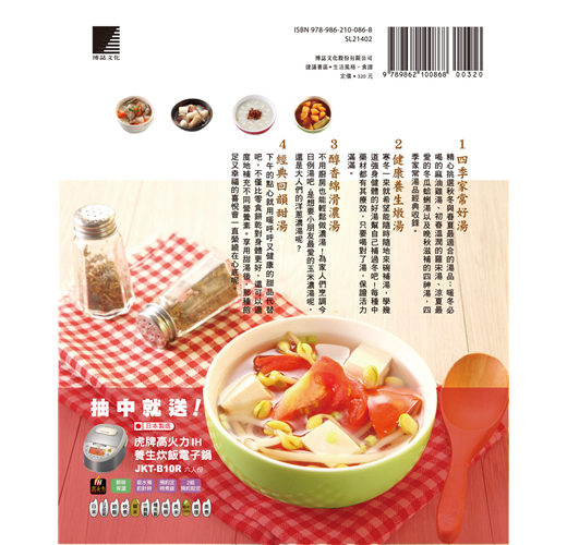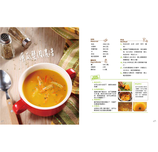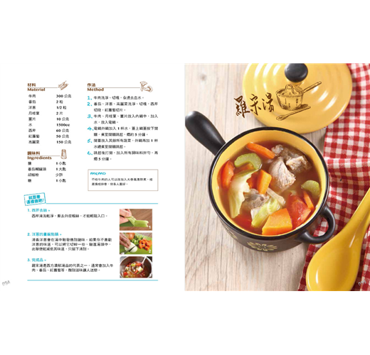 ★本書使用了電鍋、電子鍋來烹調,只要輕輕一按,熱騰騰的美味好湯將溫暖你的心!