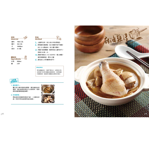 「絕對不失敗的湯料理」這樣的提案非常適合上班族或小家庭。「絕對不失敗」,只要使用電鍋或電子鍋煲湯,就完全不需擔心爐火大小或是燒焦黏鍋等等要不斷注意的事情。當一按下烹煮鍵,就能在這段時間離開做更多的事情,不僅節省時間,又方便了每個人。「湯料理」,在每天餐桌上是必不可少的。你可能會為了節省準備時間,少做一道菜,但卻不會忘記煮碗湯,由此可知湯的重要性。在需要養生健體的秋冬時節,你可以把握時機進補,煲煮個薑母鴨、麻油雞溫暖身心;在需要清爽退火的春夏,燉煮個冬瓜蛤蜊湯或鮮蚵湯去油解膩。