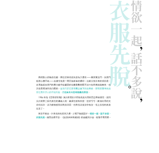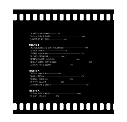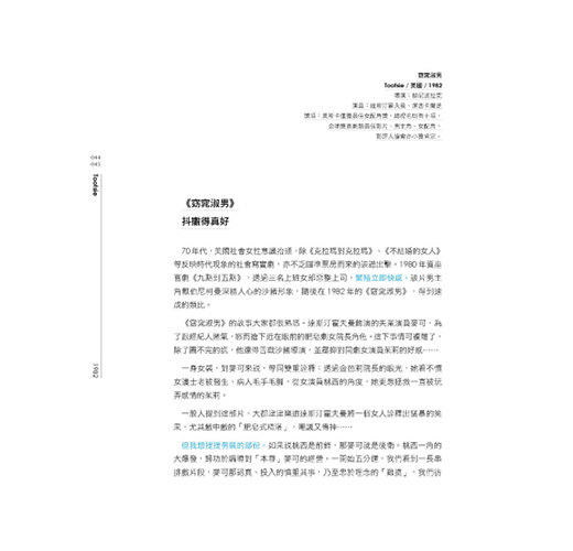 全書細分為十七章:「叫她們女神」、「媒體內含光」、「人的上半身」、「也有下半身」、「看你往哪逃」、「從前,夢想家」……等應有盡有。作者嘔心瀝血、皓首窮經般的寫作歷程,從籌畫本書到全部完成,費時整整兩年時間,為他個人的創作推向另一個高峰,作者號稱此書為個人「最重要的代表作」。本書每一篇章篇篇精彩絕倫,並附有導演、演員及得獎相關資訊,方便讀者深入了解每部電影的背景。