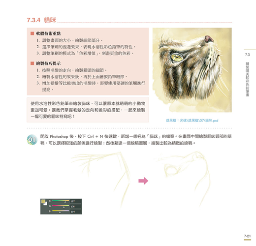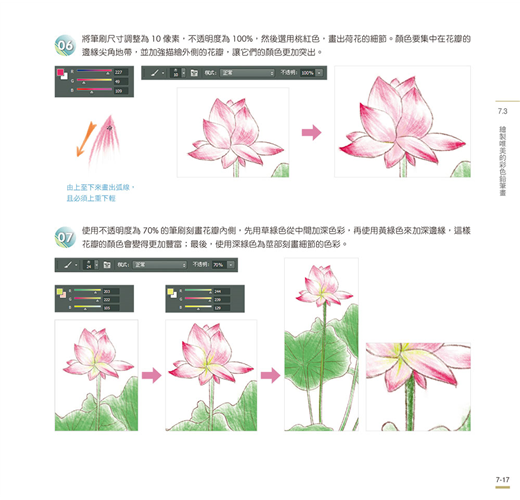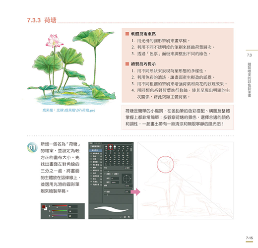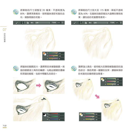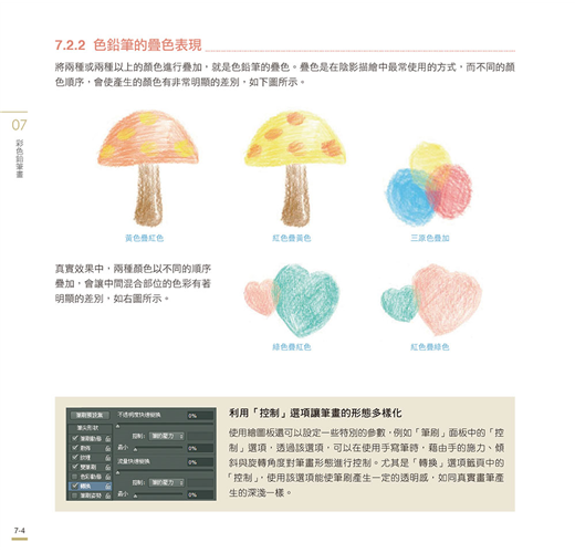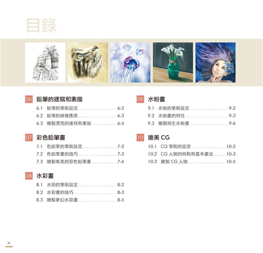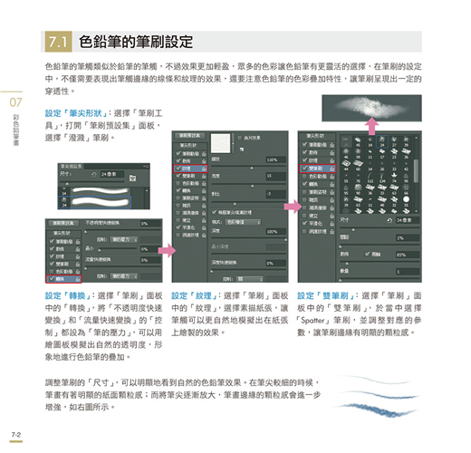 針對不同繪圖風格,除了範例講解之外,也指出該風格的筆刷設定,讓讀者能輕易模擬出該風格的筆刷質感。