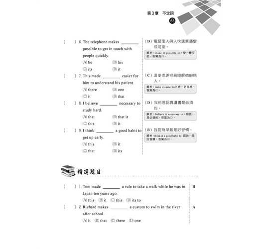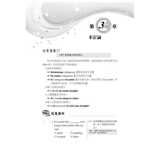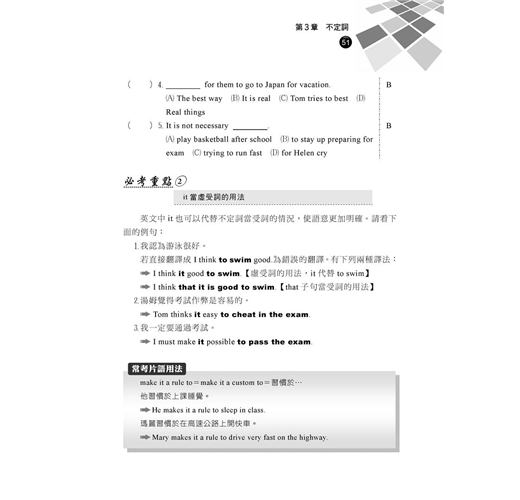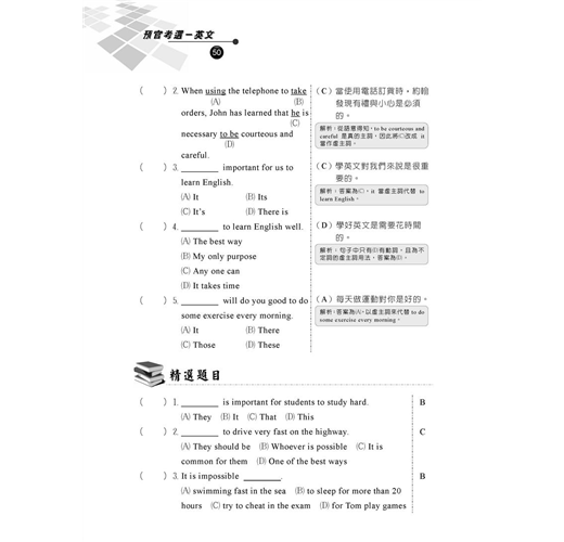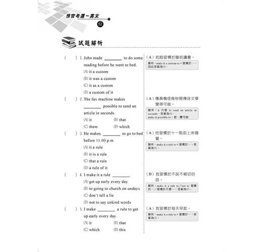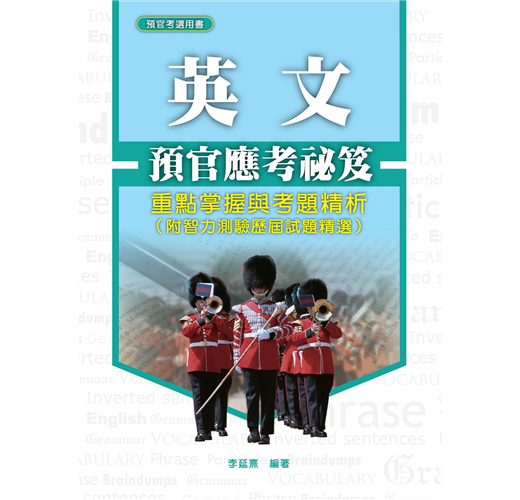預官英文的考試類型為單字、文法與閱讀測驗共四十題。單字中包含類似全民英檢中高級以上的單字、片語與慣用法;文法集中於倒裝句、分詞、動名詞、不定詞與關係代名詞等用法。本書提供上述文法及片語的重點整理,以及相關的試題分析與理解,考前能夠先了解考試類型與相關題目的難易度。另亦收錄了94~103年的預官英文考古題。
