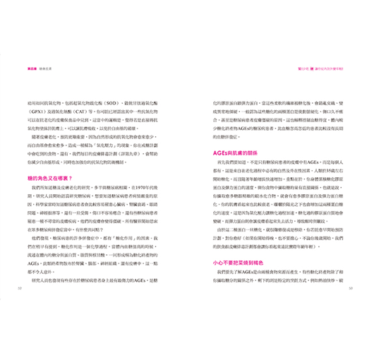 因為血液裏過多的糖總是要有個去處,所以這些在身體裏面的糖就會附著在蛋白質分子上,此類蛋白質與糖的聚合物叫做糖化終產物(advanced glycation end products,AGEs),我們可以在所有器官系統裏看到AGEs的蹤影,AGEs會誘發體內大範圍的發炎,造成組織受損,還會使身體提早老化。簡單講,這些裹著糖衣的蛋白質實在不是我們的好朋友。