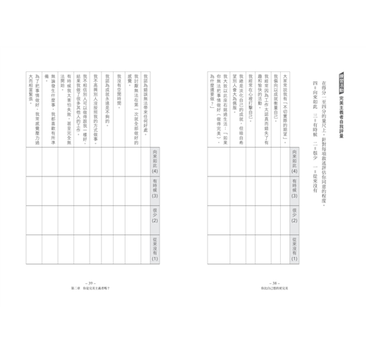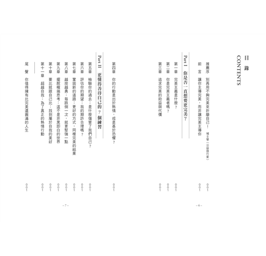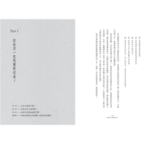 如果是這樣,這本書再適合你不過了。我希望你把這本書變成自己的。質疑那些對你沒用的事情;標記希望重讀的部分;記錄你的想法和觀察;回答每個章節的問題,藉此開始改變人生的過程。在此,我邀請你全心投入這本書。將你腦中的想法寫在紙上,你會更深入了解完美主義者的模式可能如何影響你的人生,並且可以如何做出適用於你的改變。