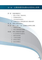 全書以初階與中階經理為預設的應用者,以他們在管理實務中所需要的心理學常識為主體,盼望透過簡潔淺白的論述與文字,帶領管理學院大學部的學生,從心理學觀點與視野來理解職場中的個人、人際與團體生活,並以一個線上經理的角度來深思並落實個人的角色與功能。在個人層次上,聚焦於職場生活中心理與行為的個別差異,除了強調人格尊嚴與友善職場之外,也希望讀者開始練習、理解並發展適切的管理心理學眼光。在人際層次上,探究個體的組織進場與調適、辦公室人際關係,以及領導實務等課題,提醒經理人發展一個關懷體恤、主動結構及協助輔導的風格。在甄選與發展部屬方面,從經理人的角度探討如何甄選與訓練部屬,並評價其績效表現與提供績效回饋等課題。在組織層次上,則探討如何建構一個健康安全的職場,以及引導部屬發展個人的職涯。略覽這些範疇與主題之後,將進一步指出一些晚進的趨勢,提供讀者預覽個人與職場在未來的嶄新挑戰,尤其指出管理發展上的修練之道。題。在組織層次上,則探討如何建構一個健康安全的職場,以及引導部屬發展個人的職涯。略覽這些範疇與主題之後,將進一步指出一些晚進的趨勢,提供讀者預覽個人與職場在未來的嶄新挑戰,尤其指出管理發展上的修練之道。
