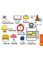 這是一本互動學習的認知書,書本裡有很多圖案精美的按鍵:蛋糕、車子、薯條。當孩子用手指觸摸圖畫書時,英文或中文的聲音就出現了;狗兒、綿羊的叫聲也出現了!好多的圖案都可以按一按、發出可愛的聲音,認識好多動物、交通工具、衣服、家庭稱謂、昆蟲、鳥類、食物、蔬果花卉、和身體、動作,讓孩子玩得很開心,學習不同主題事物。