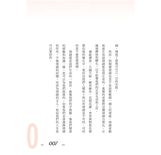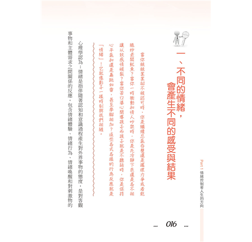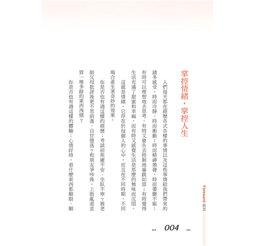 當你兢兢業業卻不被認可時,你是繼續忍氣吞聲還是據理力爭或者乾脆炒老闆魷魚?當你一時衝動和情人吵架時,你是先冷靜下來還是各不相讓以致感情破裂?當你苦口婆心開導孩子而孩子就是不聽話時,你是保持心平氣和還是暴跳如雷,甚至拳腳相加?這些各式各樣的行為反應就是「情緒」!它就像影子一樣時刻與我們相隨。