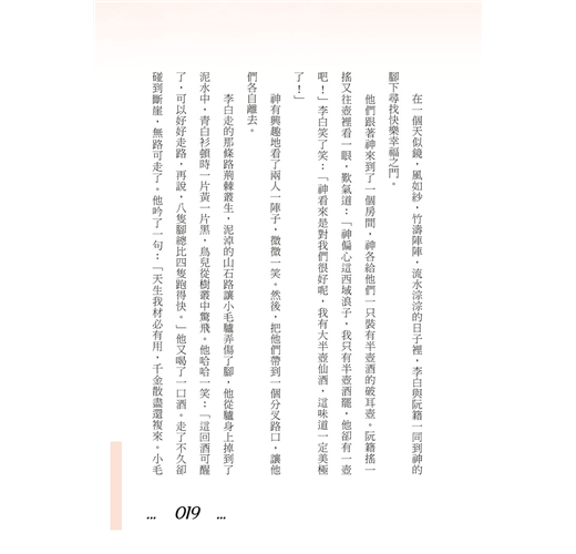 他們跟著神來到了一個房間,神各給他們一只裝有半壺酒的破耳壺。阮籍搖一搖又往壺裡看一眼,歎氣道:「神偏心這西域浪子,我只有半壺酒罷,他卻有一壺吧!」李白笑了笑:「神看來是對我們很好呢,我有大半壺仙酒,這味道一定美極了!」
