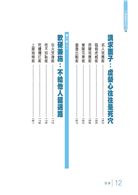 有鑑於此,本書宗旨即在救援心理學家沒有完成的任務,針對各種不同情況見招拆招,為讀者指明了突圍的方向,還明確闡述該如何突圍、選擇什麼樣的方法、應該要注意的問題等等。本書不僅要引領你走出困境,而且還能帶你走向人生的制高點,獲得最後的勝利。最後,祝福你能安然跨越過各種險惡陷阱,克服不同挑戰,迎向屬於自己的幸福人生!