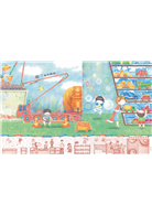 此外,她用單色畫面表現焦急的父母搭電梯到各樓層尋找兒子的慌亂場景,對比小男孩玩耍的彩色畫面;另在最後設計了一個往上翻的大翻頁,呈現出熱鬧的百貨公司,讓讀者可以對照前面的樓層,看到每一層樓琳瑯滿目的商品與熱鬧的逛街人潮。