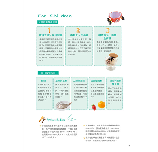 ◆貼心提示〈不同階段的食品及注意事項〉、〈認識頭好壯壯的營養素〉、〈不健康的市售食品〉、〈對孩子最好的10種食物〉、及〈常用食材熱量表〉,詳細的飲食資訊,讓您掌握家中寶貝的發育需求,全方位照顧兒童健康。