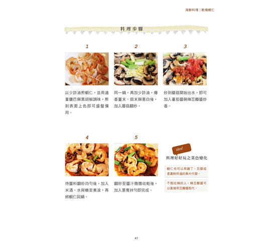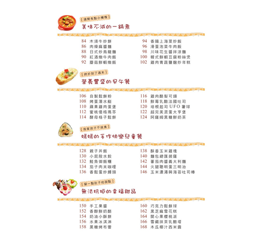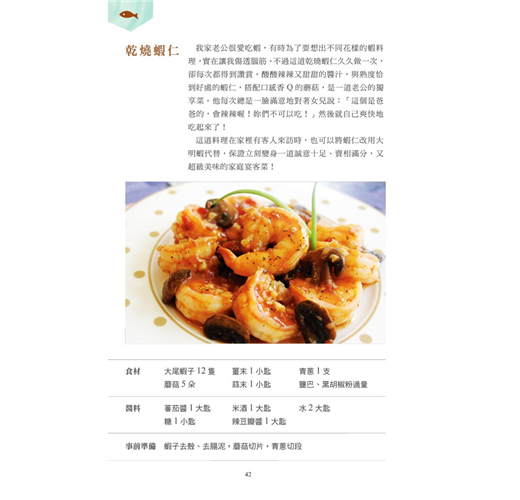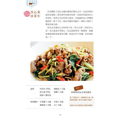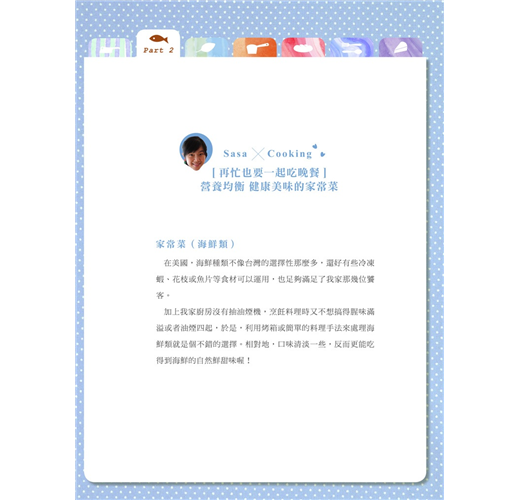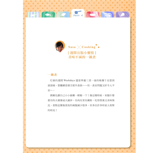 莎莎總說,她們家餐桌上沒有豪華又複雜的菜色,只有簡單的幸福家常菜。我想,就因為簡單,所以她的食譜很容易讓人上手,也容易大受好評。也因為家常,所以更能吃到「媽媽」的幸福滋味,也容易讓人吃在嘴裡暖在心坎裡。書裡「再忙也要一起吃晚餐」的單元中,莎莎利用不同的調味醬料,示範了海鮮魚肉跟蔬食各樣食材的料理方式。如果能好好善用這些實用的百搭醬料,就算是相同的食材也能讓你擦出不一樣的火花,豐富了你的料理。書中也有適合一個人或是想要偷懶時「一鍋到底」的一鍋煮,更有適合孩子們的週末早午餐及快樂兒童餐,裡面更集結了許多莎莎的人氣料理,我相信,絕對能讓你收服一家老小的胃。