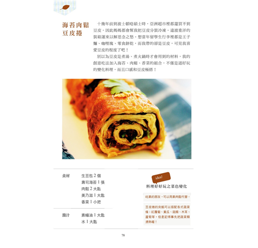 2012年,為了一解思念台灣美食的鄉愁,更為了在廚房打造一個屬於自己的味道──漂洋過海的台灣味,開始於個人部落格分享圖文版食譜。雖然沒有受過專業廚師訓練,但是秉持著「用真心料理食物,用食物享受生活」的初衷,希望可以把心意藉由料理食譜,幸福分享給每一個人。