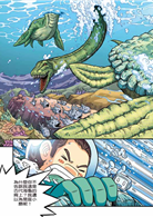 火山爆發了!眾人趕緊搭乘改造後的基地來到海上,引擎卻在此時故障,潛入海中修理的石頭也不幸被漩渦捲走!擔心的小宇想馬上出發搶救石頭,卻被博士阻止,他該怎麼辦呢?獨自在海中漂流的石頭,身處肉食性爬行動物環伺的險境中,他該如何逃脫呢?分隔兩地的X恐龍探險隊,能夠克服重重難關,平安的再次重逢嗎?