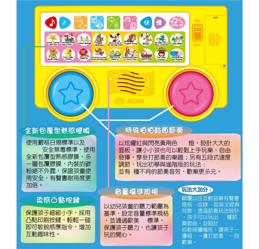 2. 音量標準規格:以幼兒孩童的聽力範圍為基準,設定音量標準規格,並通過歐美DB標準,保護孩子聽力,也讓孩子玩的開心。