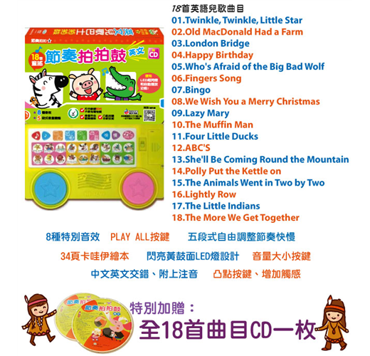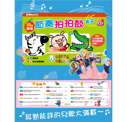 ★ 收錄18首英文經典兒歌,透過節奏玩法設計,孩子可以玩出144種節奏歌曲,並設計Play all自動接續播放,讓孩子一邊唱、一邊打節奏、一同歡樂。