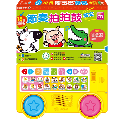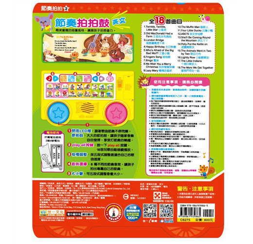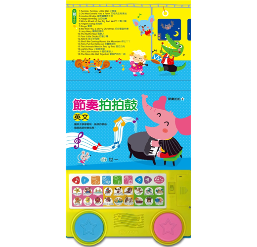 5. 玩法大加分:顛覆以往互動音樂有聲書規格,收錄18首英文經典兒歌,透過節奏玩法設計,孩子可以玩出144種節奏歌曲,並設計Play all自動接續播放,讓孩子一邊唱、一邊打節奏、一同歡樂。