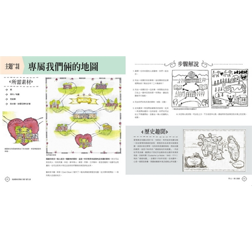本書獲得美國、加拿大的中、小學大量採用,作為團體活動與小組創意的基礎。作者在書中採用出乎意料之外的技巧和媒材,將常見的筆畫、墨水、毛線、公車票、馬賽克拼貼技術加以運用,做出魅力四射的茶漬仿古海盜藏寶圖、立體冒險圖等。甚至,連你的鼻子都能拿來畫出等高線!