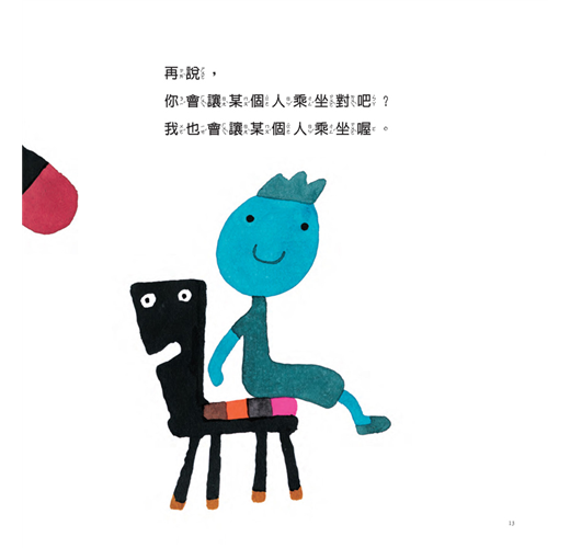馬兒一點都不相信,但是椅子說他們都一樣有四隻腳、一樣會被人乘坐、一樣會死亡壞掉……