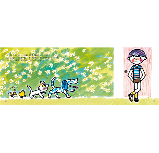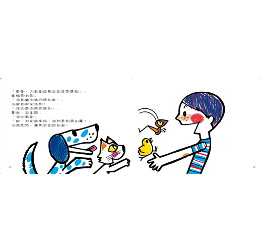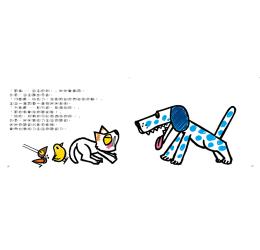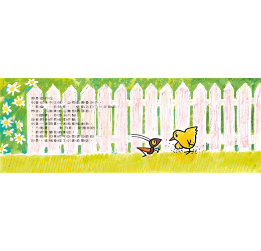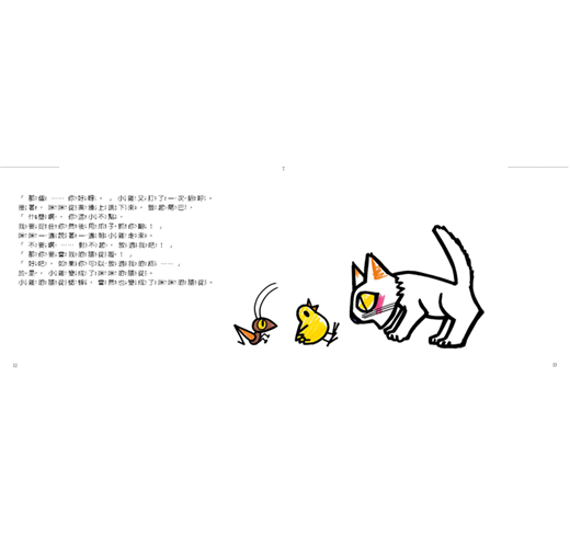 還要蟋蟀當牠的隨從。蟋蟀跟著小雞走啊走的,遇到了貓咪,貓咪也兇兇的,很不開心。